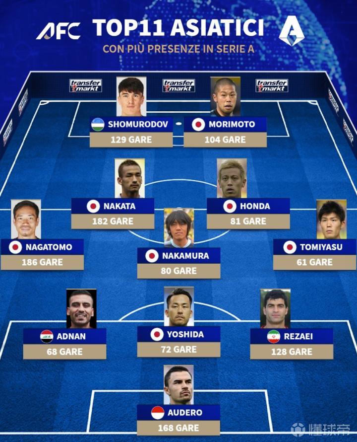 意甲出場數最多的亞洲球員11人陣容:長友佑都、中田英壽領銜